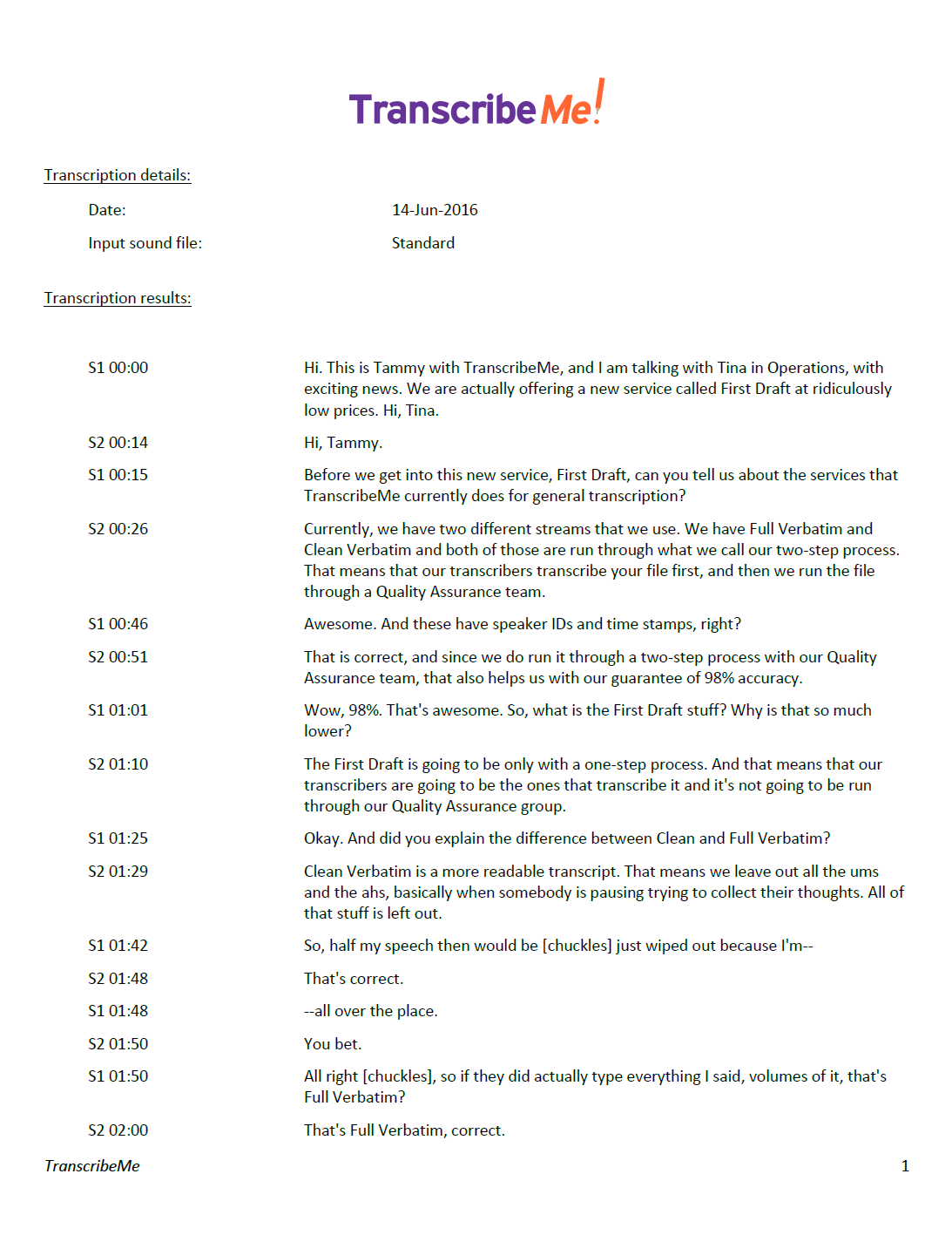 Different timestamp intervals: Right now we timestamp at every speaker change, however some clients would like custom timestamps at every minute of a dialogue as an example – we’re happy to make those timestamp customizations should you need them.